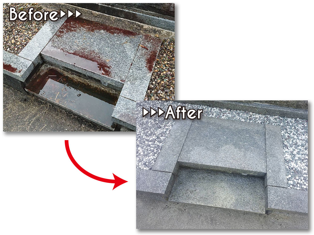 当店では、墓石のクリーニングから目地の補修、敷地内の整地・草取りまでを一貫して行い、清潔で整った墓所へと再生いたします。