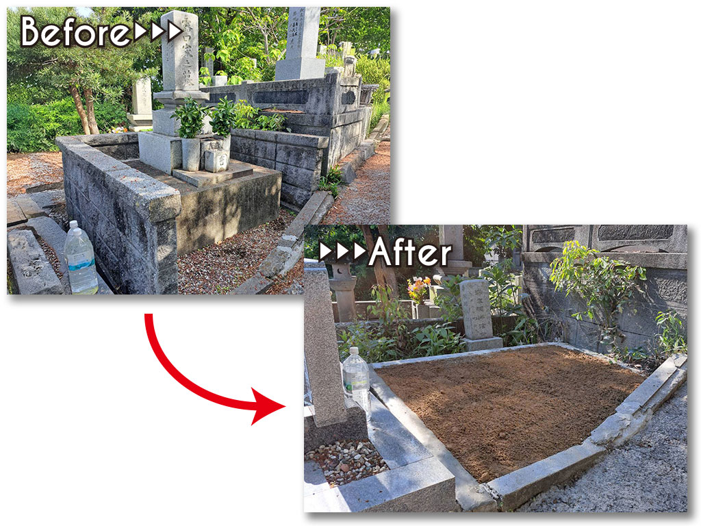 上の写真のように、長年守られてきたお墓をきちんと片付け、周囲にも配慮した美しい更地へと仕上げます。